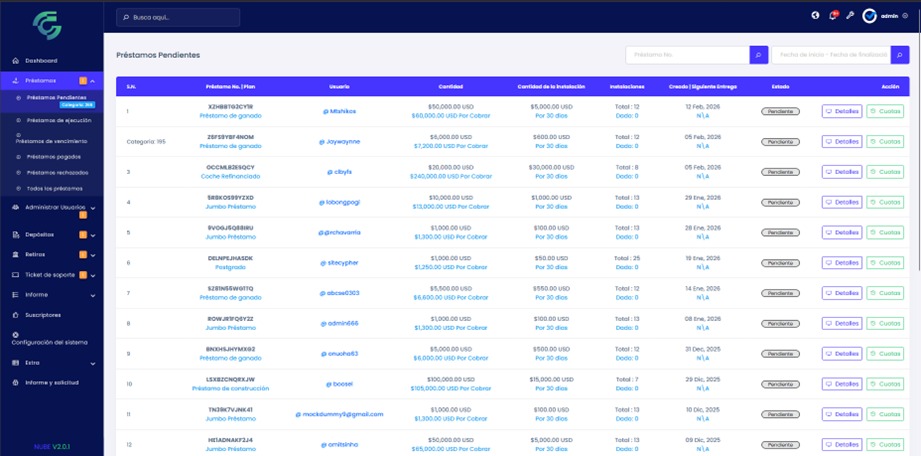 Creación y control de préstamos Cálculo automático de cuotas e intereses Registro de pagos y morosidad